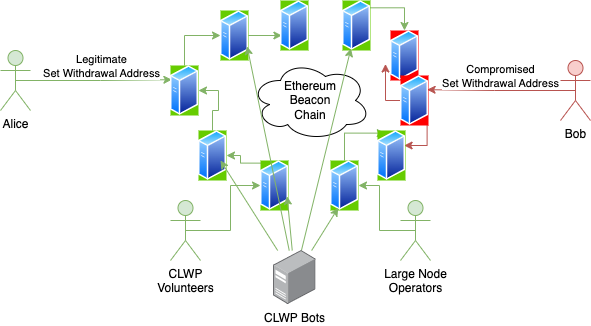 We found another way: social consensus. By convincing a broader community of the evidence and incentivizing their behavior, we developed the Consensus Layer Withdrawal Protection (CLWP). Documented in EIP-4736, CLWP proposed creating a list of verifiable messages to broadcast via Ethereum consensus nodes at the Shanghai Capella hard fork. The goal was to propagate CLWP messages faster than an attacker, leveraging a volunteer network “sneakernet” using submissions via a GitHub repository and low latency bots, with social arbitration moderation using Kleros curated lists. None of this social consensus changed Ethereum on-chain consensus, nor could guarantee success against an attacker. Volunteers were incentivized through altruism or self preservation of their own compromised validator by statistically shifting success in favor of legitimate validator owners.