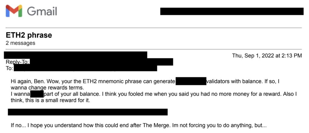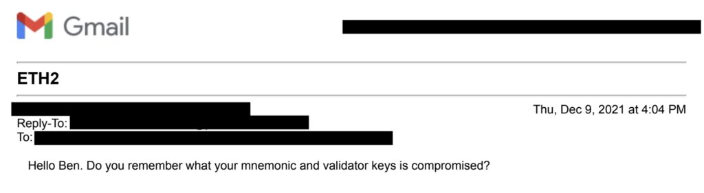 In December 2021, I received a suspicious email from an unknown contact. As I read their email, my worst fears were confirmed: my validator seed phrase was compromised, and the sender demanded a “reward.” I told my wife about the situation.